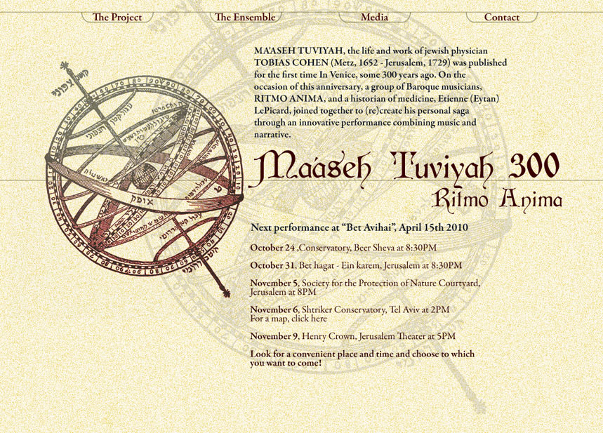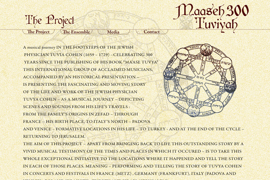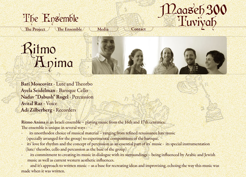 Ritmo Anima is an Early music group. Wildberry was commissioned to design a web site for a musical project called Ma'aseh Tuviyah, though these designs have yet to be implemented.