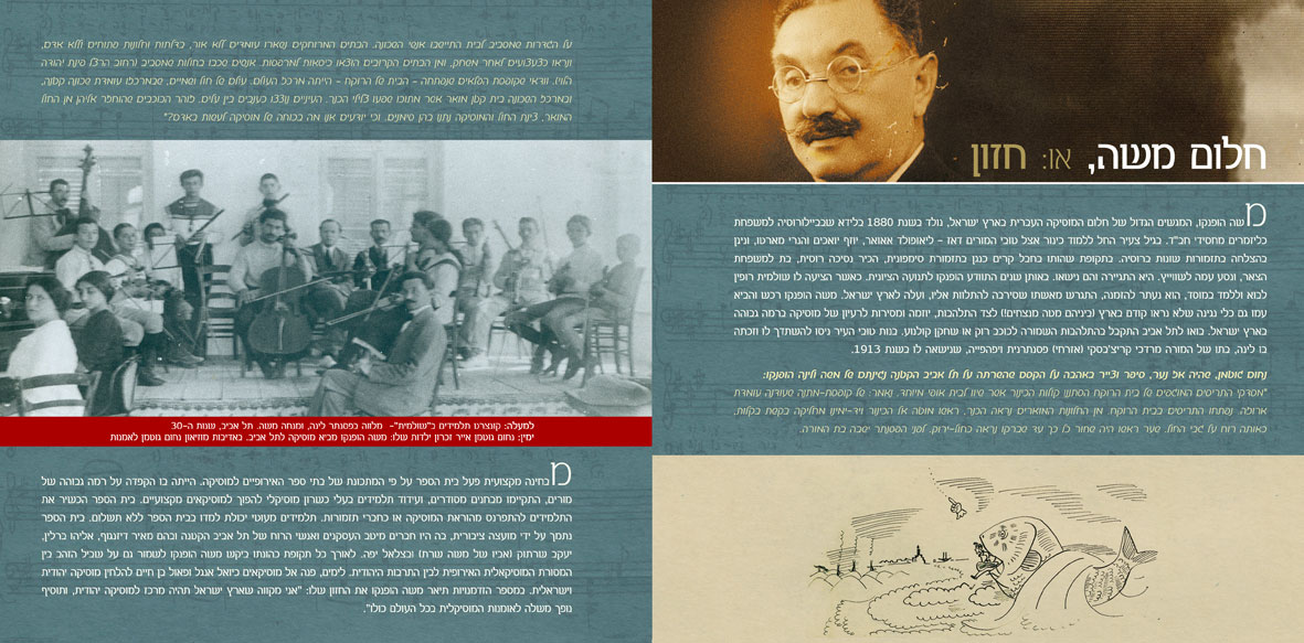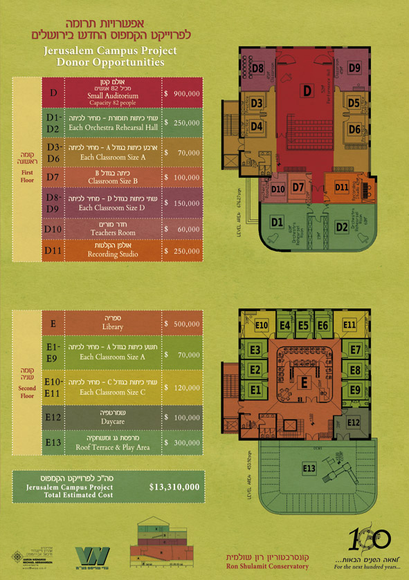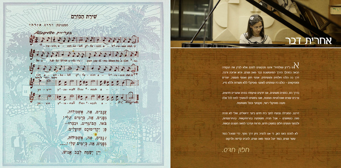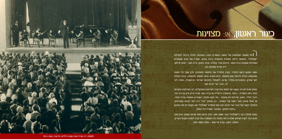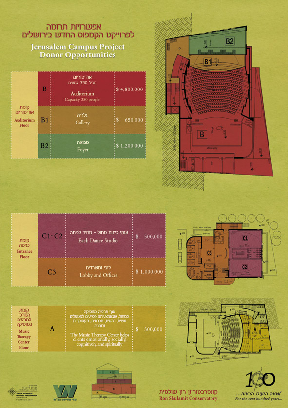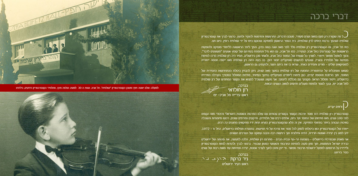 The Ron Shulamit Conservatory is a music conservatory that has served Israeli culture for the past 100 years. Wildberry was hired to design the materials to advertise the conservatory's centennial anniversary celebration. The commission included renovating the logo of the conservatory, in addition to making flyers, posters, a donor's kit, and a deluxe centennial celebration album in Hebrew and English containing two CDs, one with recordings by famous alumni, and one with performances of recent prodigies.